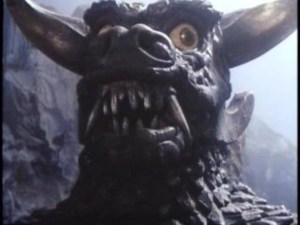 So what about the movie itself? Well, it’s a big budget monster movie, in the style of Godzilla, that was made back in the Eighties. This means many of the effects rely on a guy in a rubber suit2 thrashing around and knocking down lots of models of buildings. This actually lends a lot of charm to the picture, which it needs when you consider it’s rather dark origins. It’s a period piece (as if they could make this even stranger), and it features lavish costumes and sets, as well as a huge cast. It’s also only 90 minutes long, which is about the right sort of length for this kind of thing.
